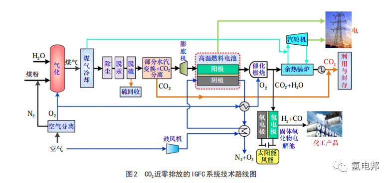 在固體氧化物燃料電池技術(shù)應(yīng)用場景方面,IGFC 技術(shù)有助于實現(xiàn)煤炭的清潔高效利用,是煤炭領(lǐng)域的變革性技術(shù)。為推進IGFC相關(guān)技術(shù)攻關(guān)和工程示范,科學技術(shù)部在2017年立項了國家重點研發(fā)計劃 “CO2近零排放的煤氣化發(fā)電技術(shù)”,由國家能源集團牽頭,聯(lián)合中國礦業(yè)大學(北京)、中國華能集團清潔能源技術(shù)研究院有限公司、清華大學等單位組成“產(chǎn)學研”攻關(guān)團隊,其核心任務(wù)是開發(fā)高溫固體氧化物燃料電池和固體氧化物電解池技術(shù),建成 CO2近零排放的 IGFC 示范工程,項目總體技術(shù)路線如圖2所示。IGFC系統(tǒng)一般由煤氣化凈化、高溫燃料電池發(fā)電、余熱回收及CO2捕集和封存等子系統(tǒng)構(gòu)成,其中高溫燃料電池發(fā)電技術(shù)是制約IGFC發(fā)展的關(guān)鍵技術(shù)。項目組目前已開發(fā)了固體氧化物燃料電池電堆和IGFC測試平臺,已實現(xiàn)了20千瓦級IGFC發(fā)電系統(tǒng)試車,下一步將依托已有技術(shù)開展100千瓦級IGFC發(fā)電系統(tǒng)示范 [12]。目前,國內(nèi)IGFC仍處于起步階段,煤氣凈化提純技術(shù)、高溫燃料電池技術(shù)、系統(tǒng)耦合控制技術(shù)等相關(guān)技術(shù)研究正逐步開展。高溫固體氧化物燃料電池技術(shù)是制約IGFC發(fā)展的關(guān)鍵技術(shù),目前,國內(nèi)的固體氧化物燃料電池技術(shù)尚未完全成熟,一方面應(yīng)加強基礎(chǔ)研究,另一方面要重點開展關(guān)鍵技術(shù)攻關(guān),降低成本,提高壽命。