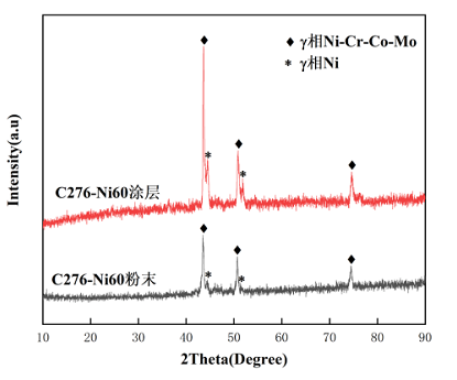 C276-Ni60 粉末和涂層的 XRD 圖譜如圖 2 所示, 結(jié)合表 1 和表 2 噴涂粉末的成分可以表明,C276-Ni60 粉末和涂層的主要物相為 γ 相的 Ni-Cr-Co-Mo, 這表明等離子焰流的溫度并沒有明顯改變 C276-Ni60 粉末的相組成。涂層和粉末實(shí)際都是以鎳基為主的 γ 相,這可能是由于噴涂的合金粉末中 Ni60 占比較低,未檢測(cè)到明顯的不同相。同時(shí)噴涂的粉末中擁有含量較高的 Cr 和 Mo 元素,因此主要物相為 γ 相的鎳基合金的涂層抗腐蝕性較強(qiáng)。